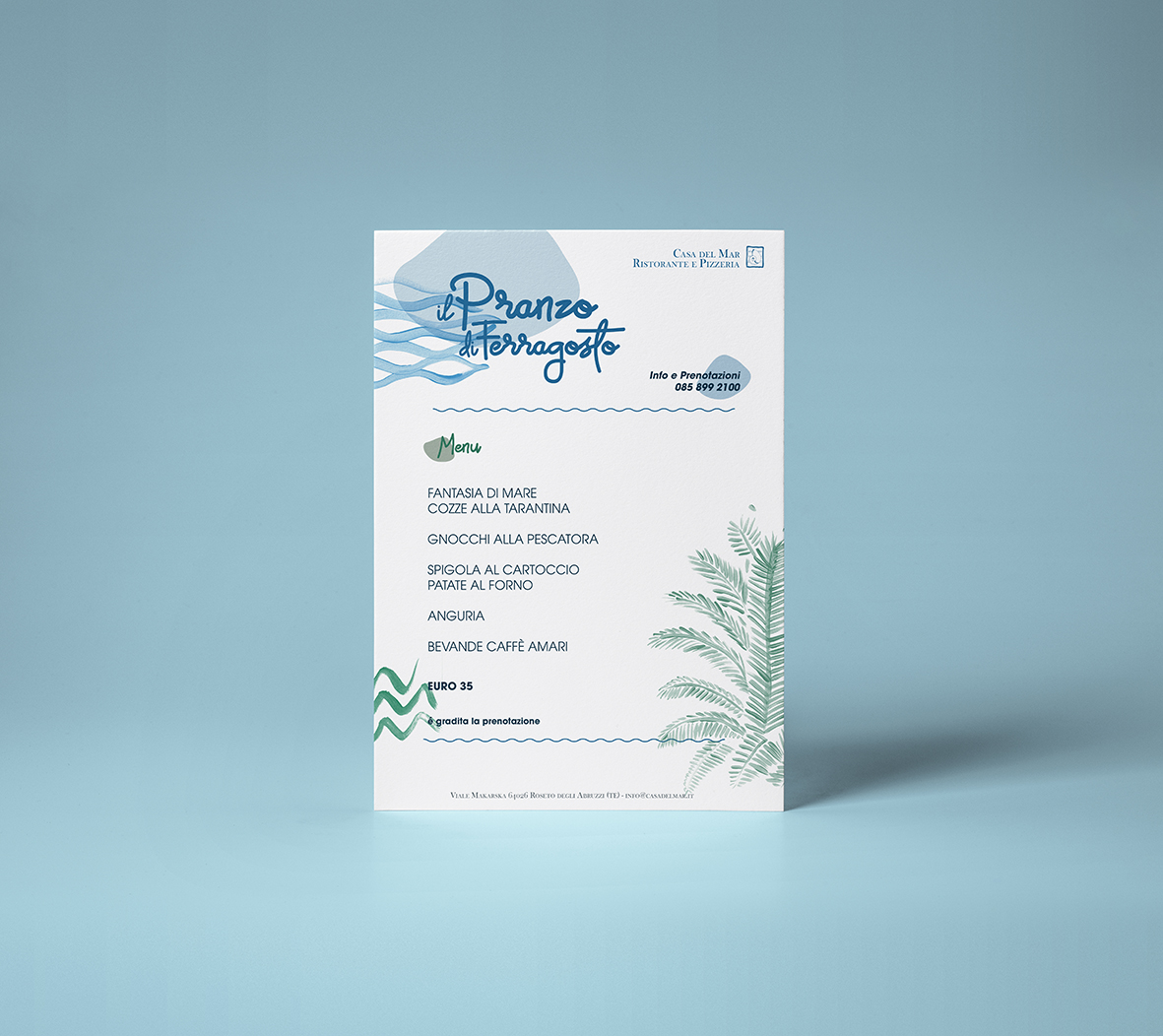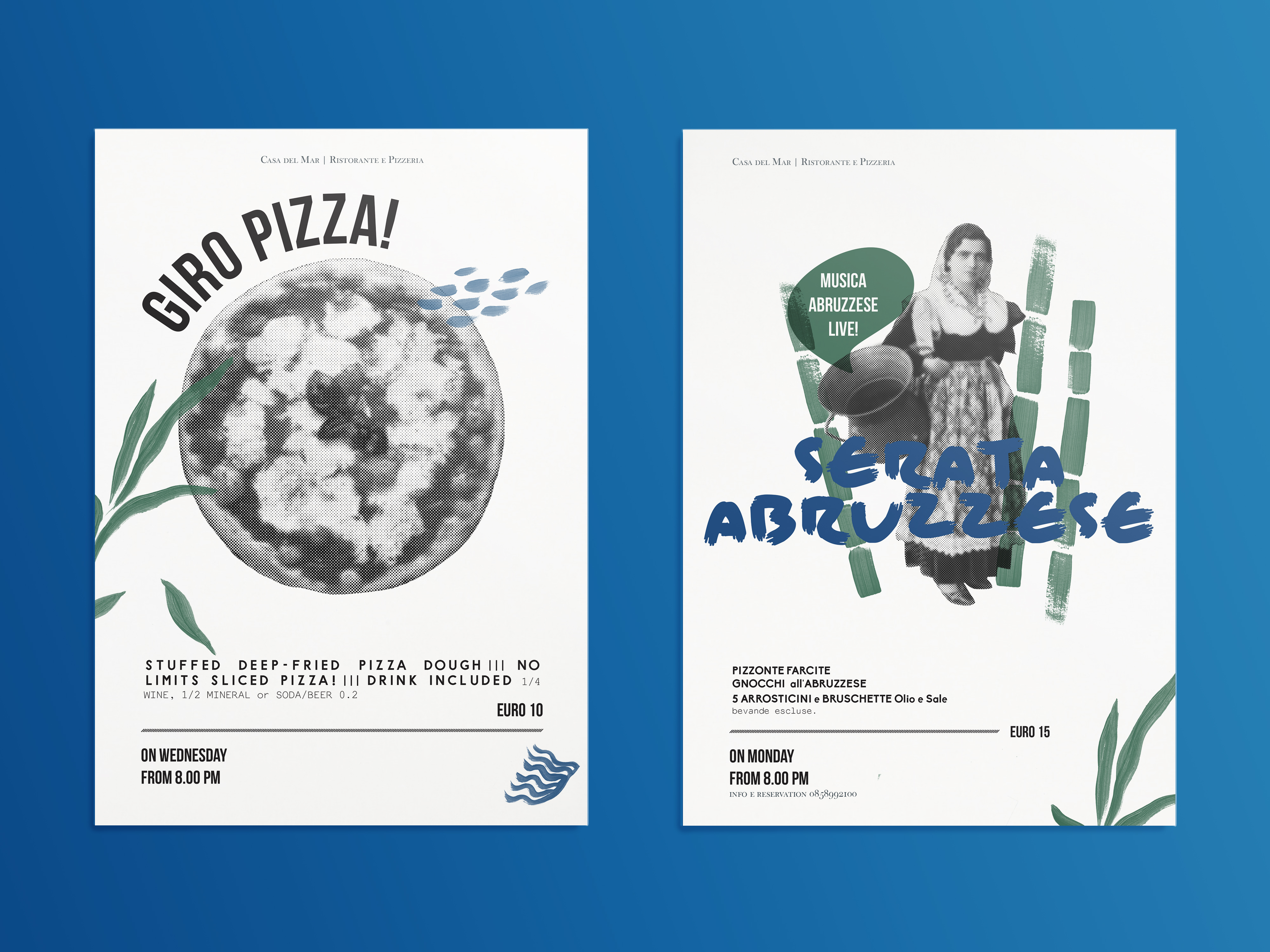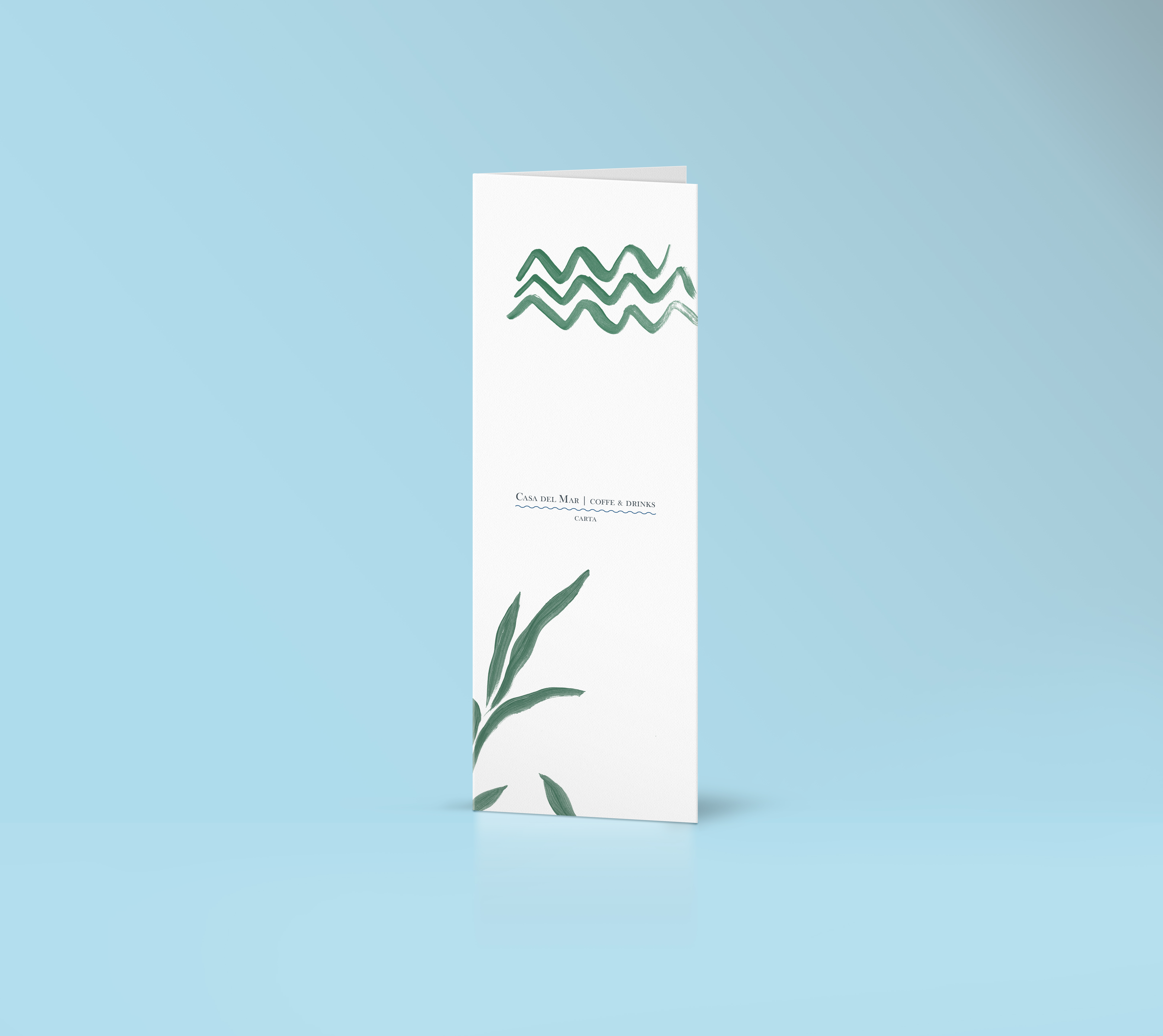 Graphics are hand-painted for this branding that include a Restaurant Menu; a Bar Menu; Event Posters; a Holyday Special Menu and Receptionists Cards for a Hotel&Restaurant on the beach, 2018.
